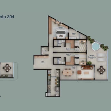 The leisure amenities were thoughtfully designed to provide comfort and well-being without leaving home. The condominium features adult and children’s swimming pools, wet deck, hydro spa, sauna, indoor and outdoor fitness areas, party lounge, kids’ playroom, and landscaped social spaces. A complete infrastructure that blends relaxation, functionality, and social living, reflecting the sophisticated beach lifestyle of Jardim Oceânico.