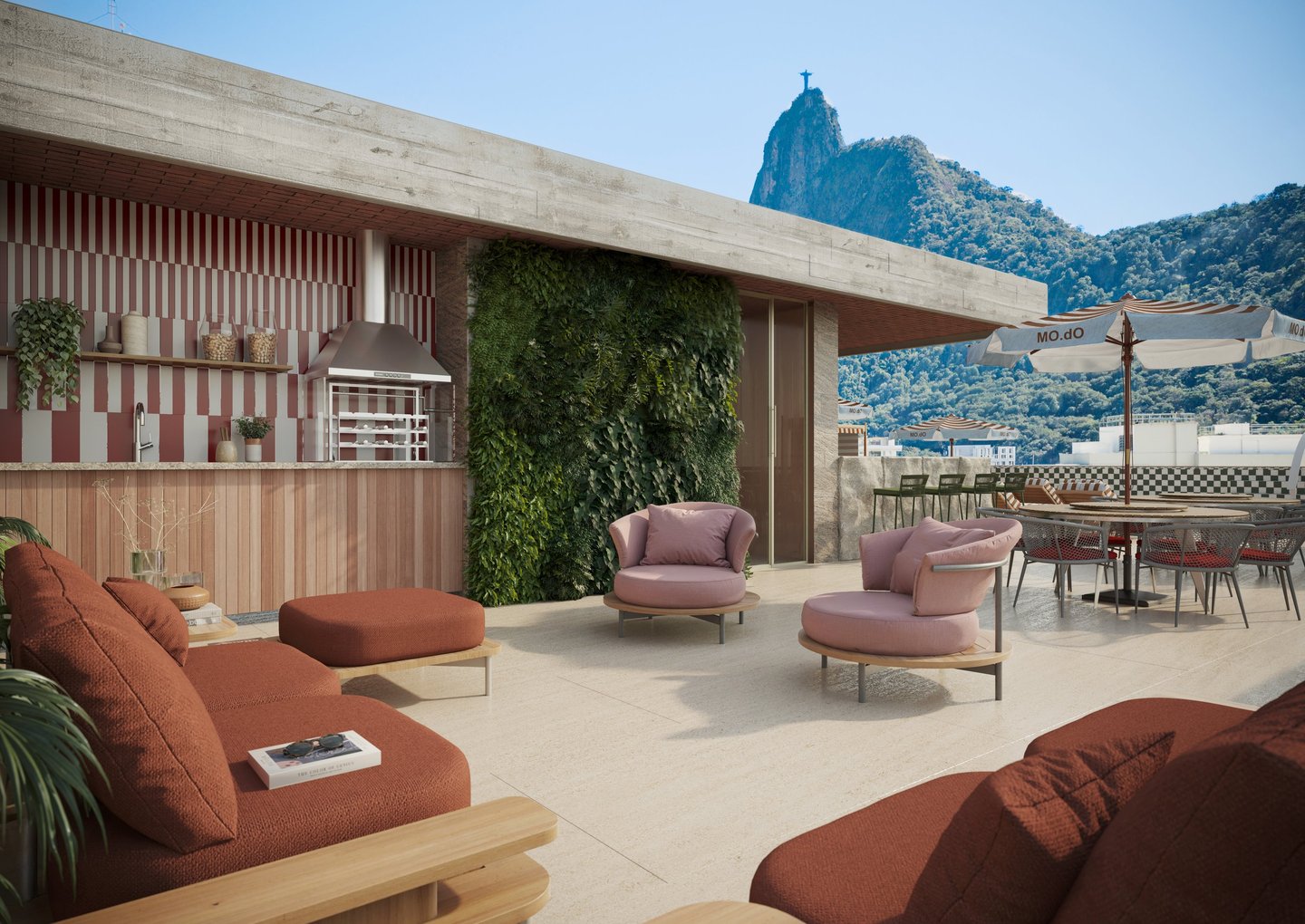 Lazer: O lazer foi projetado para oferecer uma experiência completa e exclusiva no coração urbano do bairro. O destaque é o rooftop panorâmico, que reúne piscina, sauna, lounge ao ar livre, áreas de relaxamento e espaços para socialização, criando uma atmosfera intimista e sofisticada. O projeto privilegia bem-estar e funcionalidade, permitindo que moradores e hóspedes desfrutem de momentos de descanso, contemplação e lazer em um ambiente elevado com vista privilegiada, complementando perfeitamente o estilo de vida dinâmico de Botafogo.
